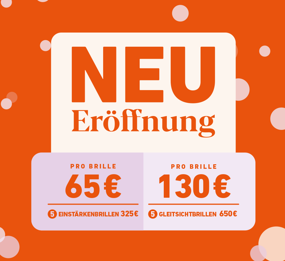 Die Preisangaben gelten beim Kauf von fünf Brillen mit Sehstärke durch bis zu fünf Personen. Das Angebot ist gültig für vier Wochen ab dem jeweiligen Eröffnungsdatum in neu eröffneten eyes + more Stores. Gültig nur in den teilnehmenden Stores während dieses Zeitraums. Die eyes and more GmbH behält sich vor, das Angebot freiwillig über diesen Zeitraum hinaus zu verlängern. Nicht kombinierbar mit anderen Aktionen (z. B. SALE) oder Gutscheinen. Der Endpreis kann abweichen bei Auswahl von DRIIVE-, THE BRANDS- oder Premium+ Gläsern sowie beim Hinzufügen des Brillenschutzes.