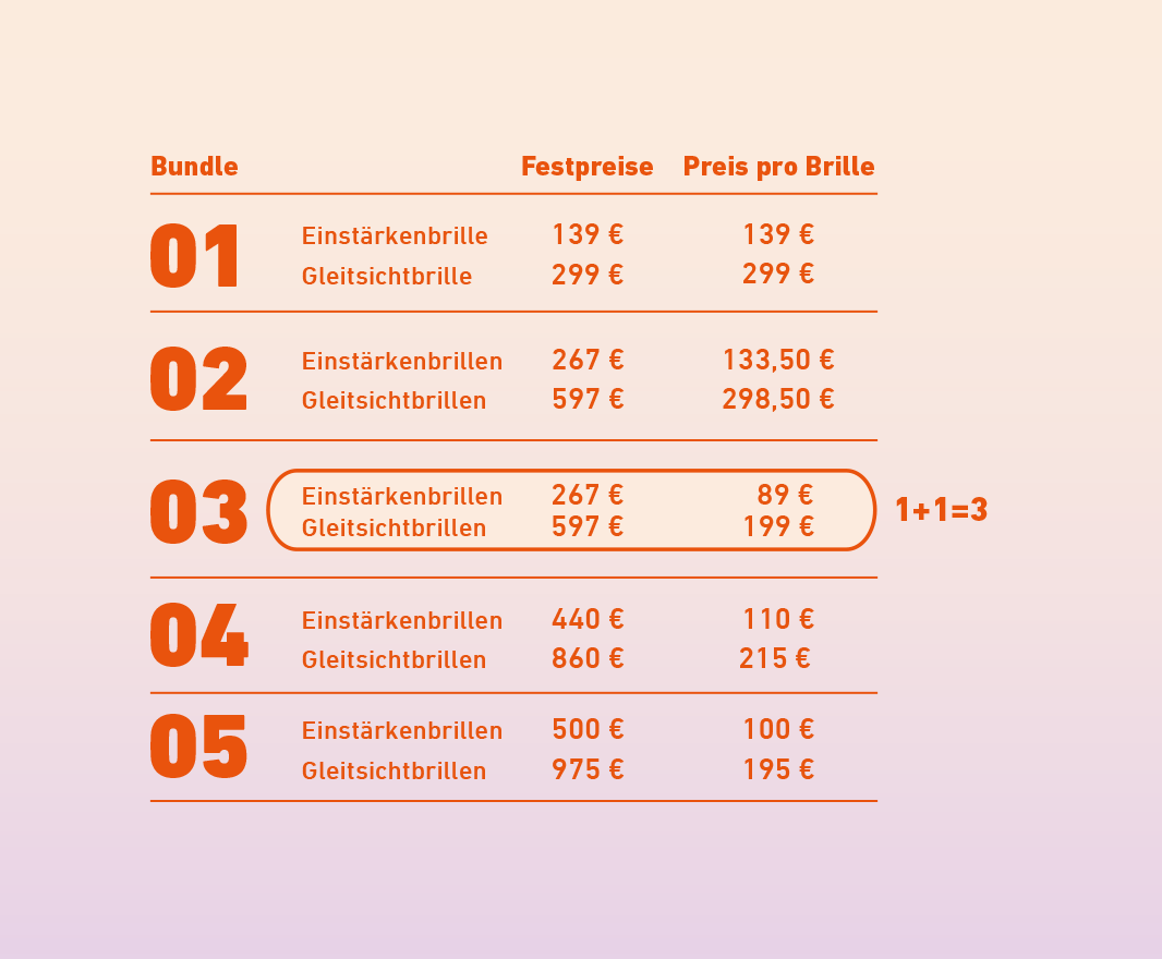 Wir finden, eine Brille sollte kein Vermögen kosten. Daher verfolgen wir bei eyes + more eine transparente Komplettpreisstrategie für unsere Produkte. Eine Einstärkenbrille bieten wir Ihnen zum Komplettpreis von 139 €, eine Gleitsichtbrille für 299 € an.